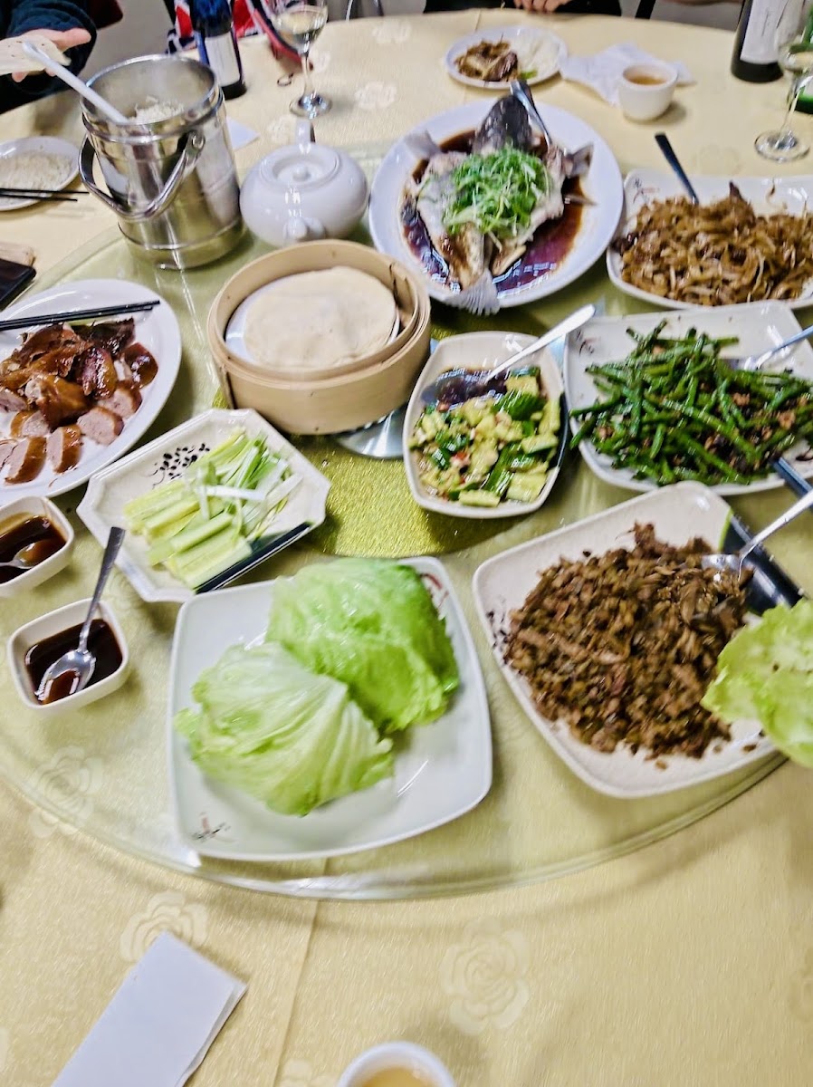 The portions are quite large. We ordered fried fish with salt and pepper, green beans, black beans with chicken, and roasted duck on rice. The fried fish could be crispier, which would improve it. The rest of the meal was fair, and I loved it.